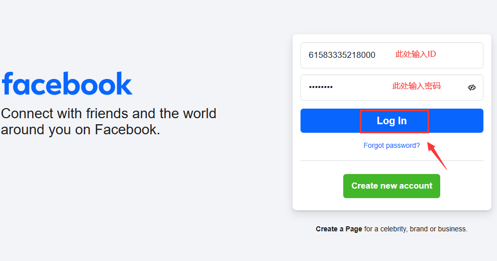 首先浏览器打开脸书登录主页 www.facebook.com ,按下图依次输入ID和密码后,点击Log In按钮直接登录: