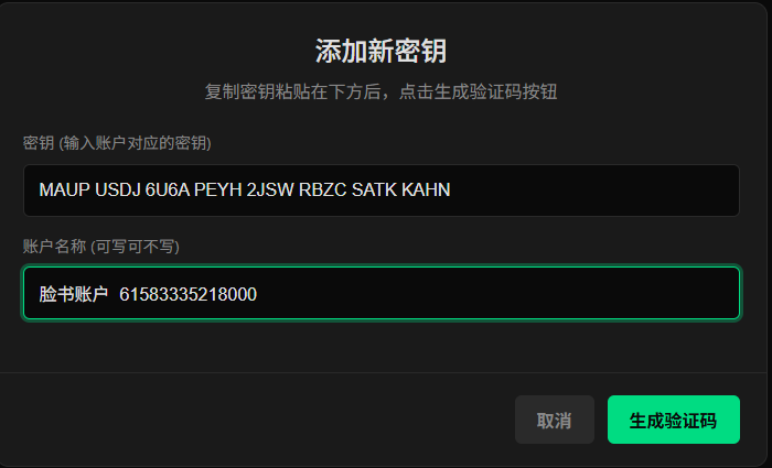 确认信息输入无误后,点击生成验证码按钮即可添加密钥成功!页面下方就会显示我们刚刚添加的脸书登录的实时验证码: