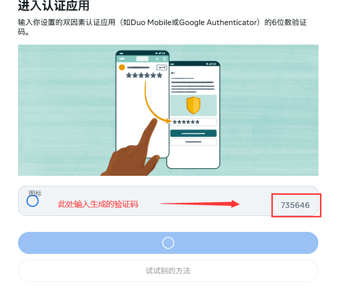 此时他会要求输入你设置的双因素认证应用(如Duo Mobile或Google Authenticator)的6位数验证码,我们只需要复制账户末尾对应的密钥 MAUP USDJ 6U6A PEYH 2JSW RBZC SATK KAHN